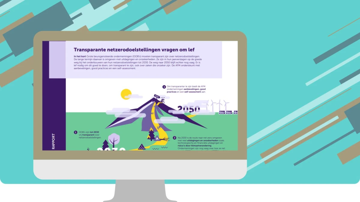 Grote beursgenoteerde ondernemingen zijn tot 2030 vrij transparant in het onderbouwen van hun klimaatdoelstellingen. Na 2030 is hun route naar klimaatneutraliteit (net zero) omgeven met onder meer technologische en financiële uitdagingen en risico’s door klimaatverandering. Ondernemingen zijn nog vaag over hoe ze net zero in 2050 gaan bereiken. Dit blijkt uit het rapport ‘Transparante netzerodoelstellingen vragen om lef' dat de AFM vandaag publiceert.